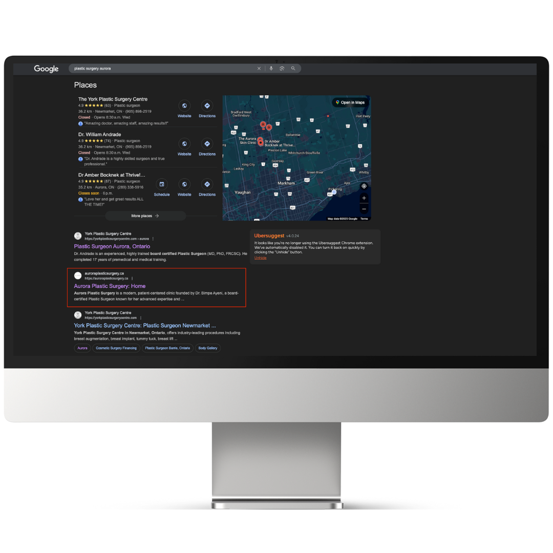 We executed a focused local SEO strategy for Aurora Plastic Surgery designed to strengthen their search visibility in the surrounding area. In a short timeframe, these efforts contributed to achieving Top 3 placement for a highly competitive location-based search related to plastic surgery services in Aurora.